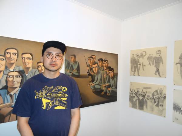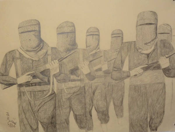 «Я приехал в Гамбург учиться в Академии изящных искусств. На курсе немецкого языка люди спрашивали друг друга, откуда они приехали: «Я – Тинг из Китая», — сказал я, другие говорили: «Я из Сирии, но на самом деле я курд» или «Я из Турции, но на самом деле я курд». Когда я спросил одноклассников из Турции, они сказали: «Это террористы». Этот конфликт заинтересовал меня, в том числе и в плане идентичности. Иногда я тоже спрашиваю себя, кто я. Женщины на картинах не носят оружия, только униформу. Кто решает, кто из них террористы? Моими картинками я бы хотел задать вопросы. Для чего они борются? Почему они носят форму? Меня интересует противоречие.
